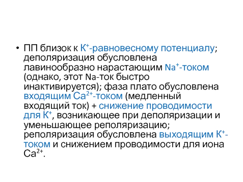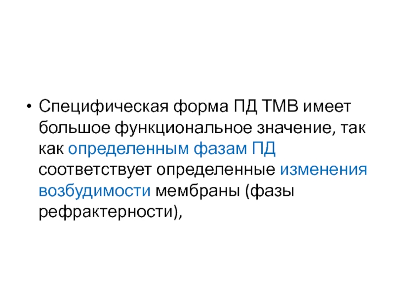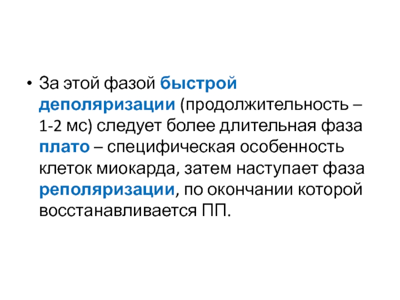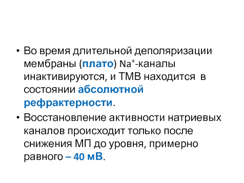 Во время длительной деполяризации мембраны (плато) Na+-каналы инактивируются, и ТМВ находится в состоянии абсолютной рефрактерности.Восстановление активности натриевых
