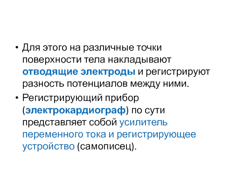 Для этого на различные точки поверхности тела накладывают отводящие электроды и регистрируют разность потенциалов между ними. Регистрирующий