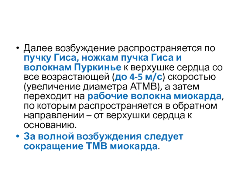 м/с) скоростью (увеличение диаметра АТМВ), а затем переходит на рабочие волокна миокарда, по которым распространяется в обратном направлении – от верхушки сердца к основанию.