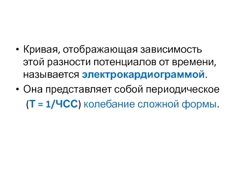 Кривая, отображающая зависимость этой разности потенциалов от времени, называется электрокардиограммой. Она представляет собой периодическое 	(Т = 1/ЧСС)