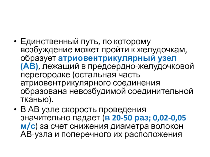 В АВ узле скорость проведения значительно падает (в 20-50 раз; 0,02-0,05 м/с) за счет снижения диаметра волокон АВ-узла и поперечного их расположения