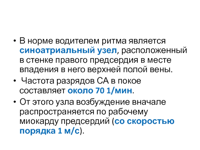 От этого узла возбуждение вначале распространяется по рабочему миокарду предсердий (со скоростью порядка 1 м/с).
