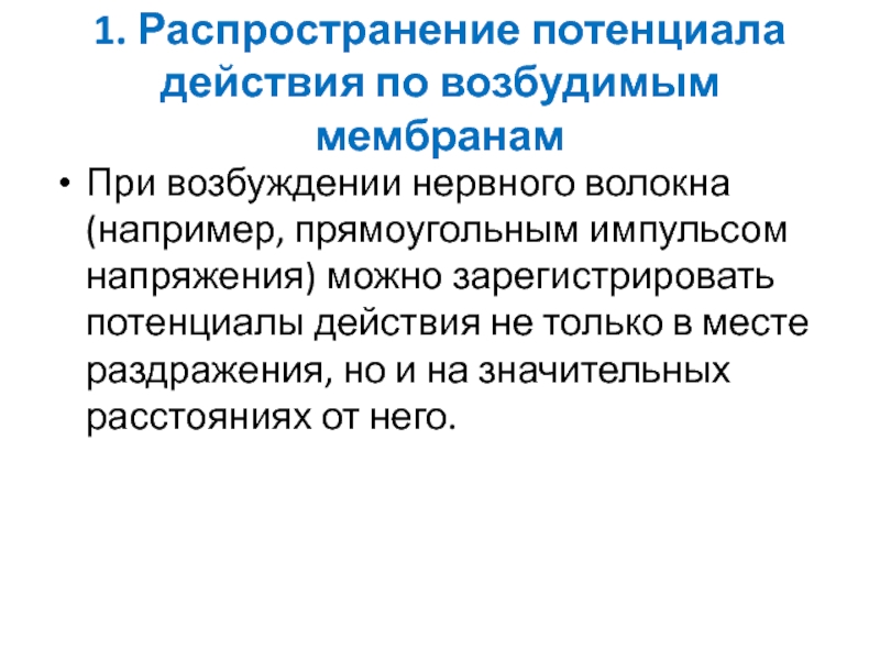 1. Распространение потенциала действия по возбудимым мембранамПри возбуждении нервного волокна (например, прямоугольным импульсом напряжения) можно зарегистрировать потенциалы действия не только в месте раздражения, но и на значительных расстояниях от него.
