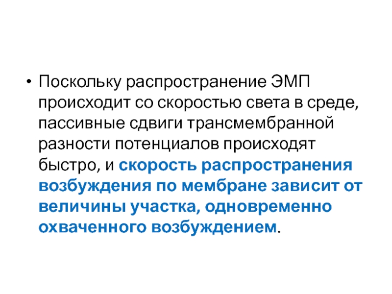 Поскольку распространение ЭМП происходит со скоростью света в среде, пассивные сдвиги трансмембранной разности потенциалов происходят быстро, и