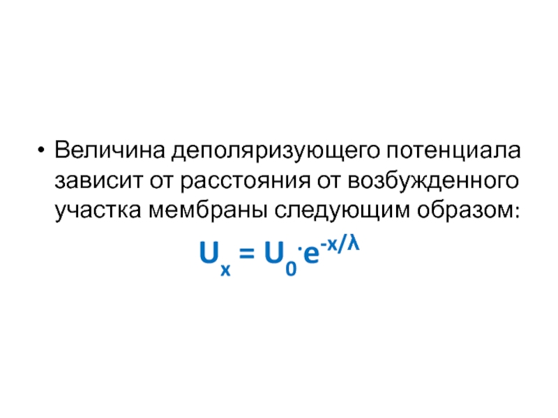 Величина деполяризующего потенциала зависит от расстояния от возбужденного участка мембраны следующим образом:Ux = U0.e-x/λ