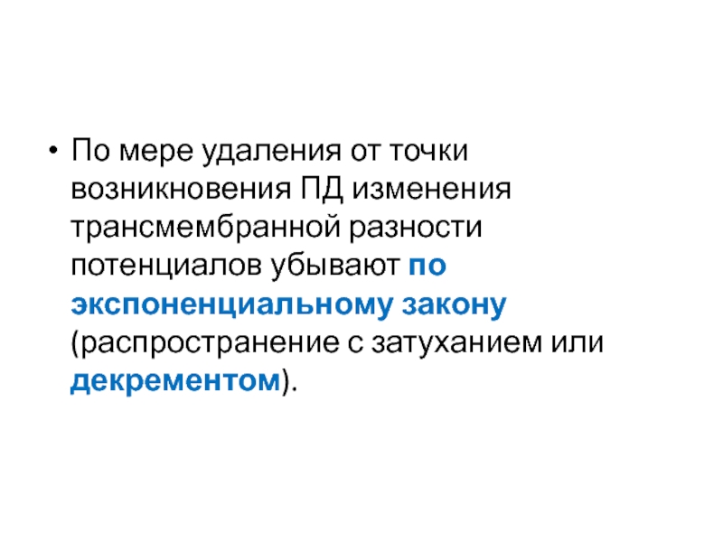 По мере удаления от точки возникновения ПД изменения трансмембранной разности потенциалов убывают по экспоненциальному закону (распространение с