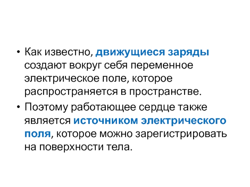 Как известно, движущиеся заряды создают вокруг себя переменное электрическое поле, которое распространяется в пространстве. Поэтому работающее сердце