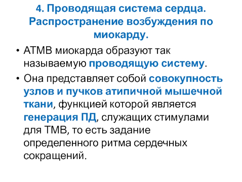 пучков атипичной мышечной ткани, функцией которой является генерация ПД, служащих стимулами для ТМВ, то есть задание определенного ритма сердечных сокращений.