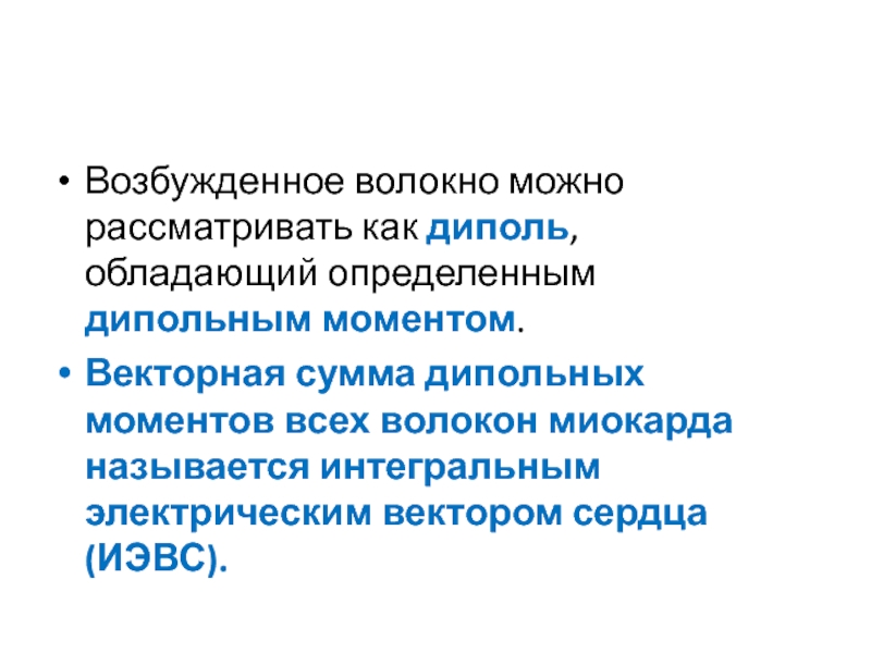 Возбужденное волокно можно рассматривать как диполь, обладающий определенным дипольным моментом.Векторная сумма дипольных моментов всех волокон миокарда называется