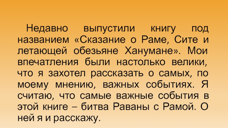 захотел рассказать о самых, по моему мнению, важных событиях. Я считаю, что самые важные события в этой книге – битва Раваны с Рамой. О ней я и расскажу.