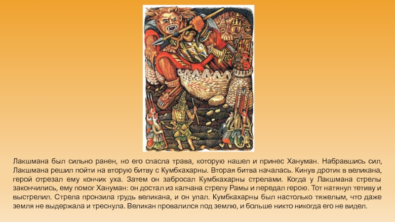 Слайд 5Лакшмана был сильно ранен, но его спасла трава, которую нашел