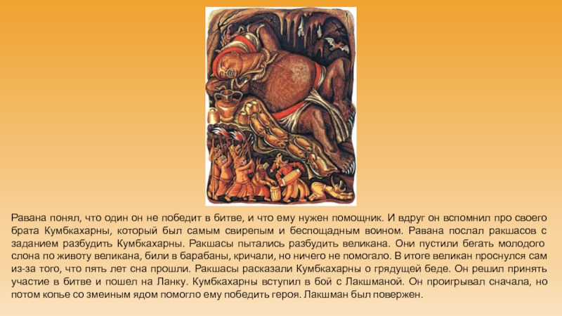 Слайд 9Самый великий из ракшасов упал, потянув за собой кучу деревьев.