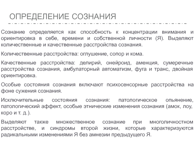 сужения сознания.патологическое опьянение, патологический аффект, особые этнические изменения сознания (амок, лоу, коро и т. д.).