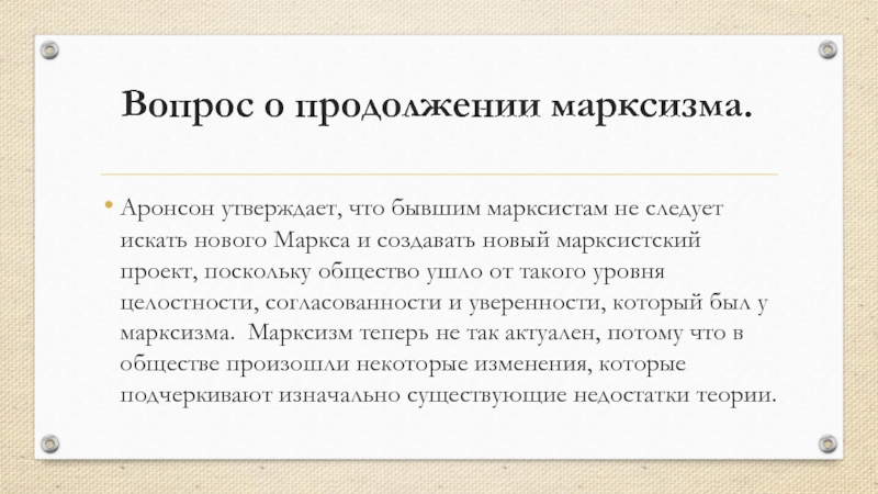 Вопрос о продолжении марксизма.Аронсон утверждает, что бывшим марксистам не следует искать нового Маркса и создавать новый марксистский