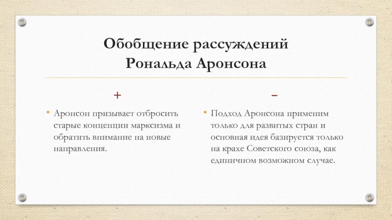 Обобщение рассуждений  Рональда Аронсона+Аронсон призывает отбросить старые концепции марксизма и обратить внимание на новые направления.-Подход Аронсона