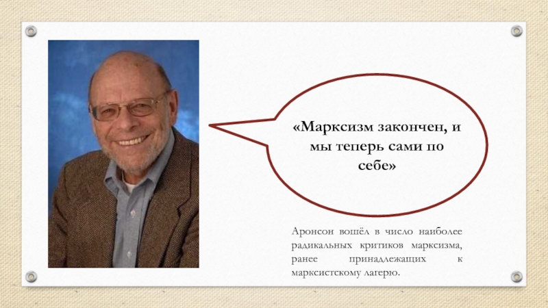 «Марксизм закончен, и мы теперь сами по себе» Аронсон вошёл в число наиболее радикальных критиков марксизма, ранее