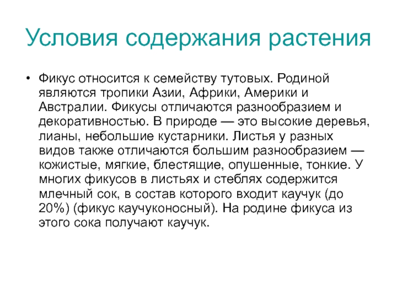 В природе — это высокие деревья, лианы, небольшие кустарники. Листья у разных видов также отличаются большим разнообразием — кожистые, мягкие, блестящие, опушенные, тонкие. У многих фикусов в листьях и стеблях содержится млечный сок, в состав которого входит каучук (до 20%) (фикус каучуконосный). На родине фикуса из этого сока получают каучук.