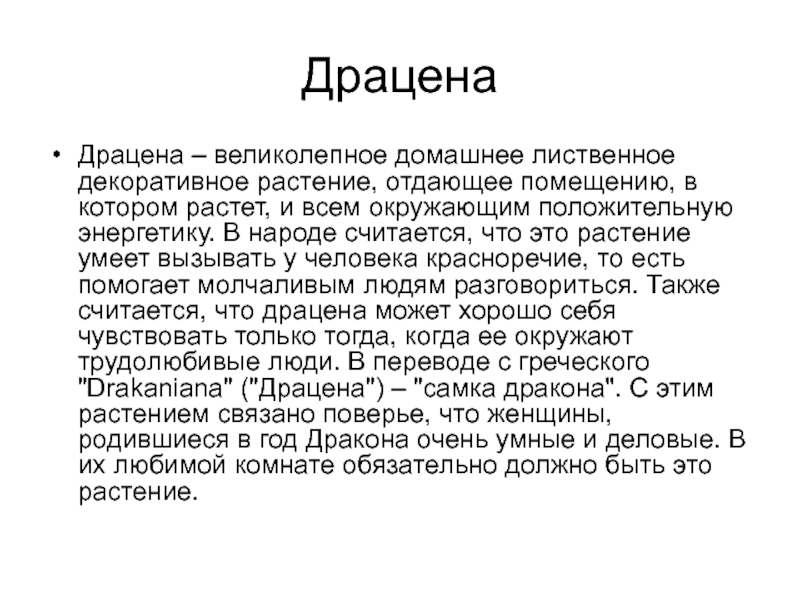 что это растение умеет вызывать у человека красноречие, то есть помогает молчаливым людям разговориться. Также считается, что драцена может хорошо себя чувствовать только тогда, когда ее окружают трудолюбивые люди. В переводе с греческого "Drakaniana" ("Драцена") – "самка дракона". С этим растением связано поверье, что женщины, родившиеся в год Дракона очень умные и деловые. В их любимой комнате обязательно должно быть это растение.