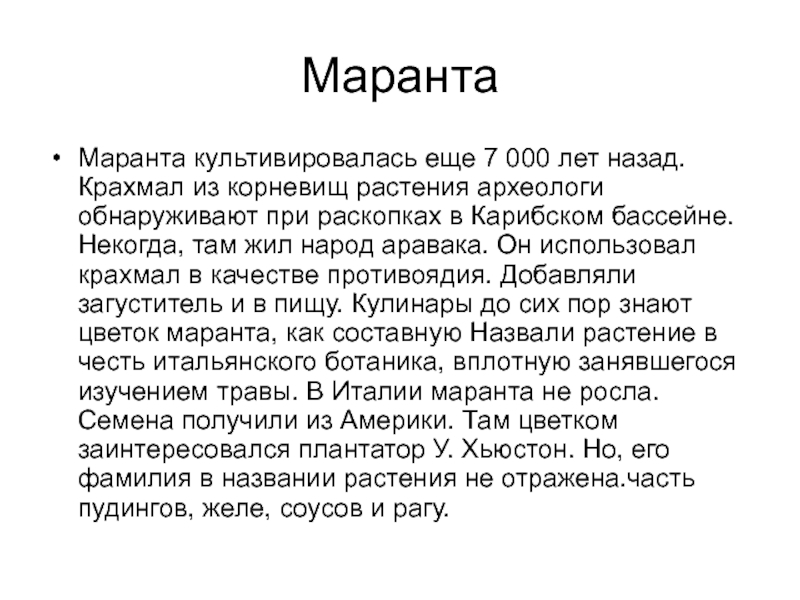 народ аравака. Он использовал крахмал в качестве противоядия. Добавляли загуститель и в пищу. Кулинары до сих пор знают цветок маранта, как составную Назвали растение в честь итальянского ботаника, вплотную занявшегося изучением травы. В Италии маранта не росла. Семена получили из Америки. Там цветком заинтересовался плантатор У. Хьюстон. Но, его фамилия в названии растения не отражена.часть пудингов, желе, соусов и рагу.