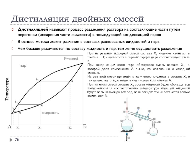Нагрев этой смеси приведёт к получению конденсата состава Х3 и так далее, вплоть до выделения чистого компонента А.