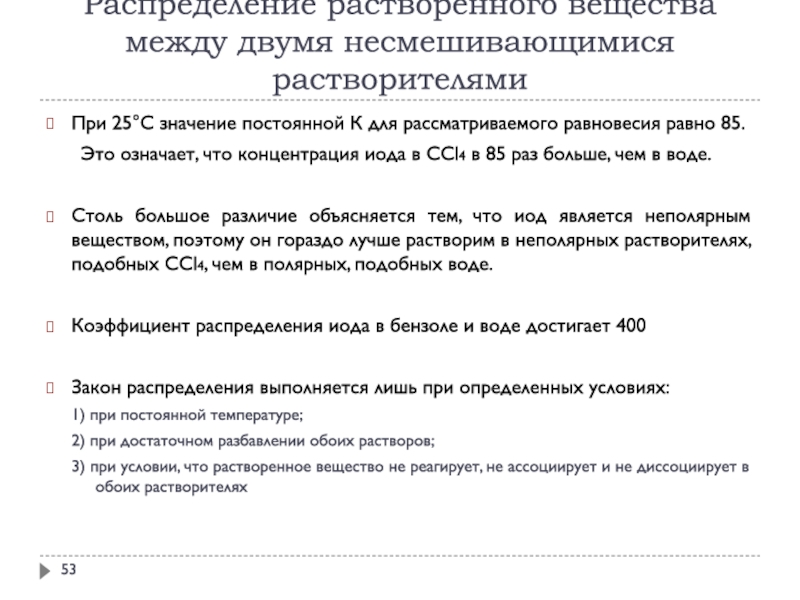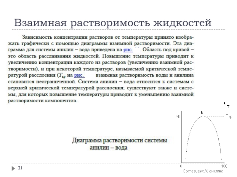 взаимная растворимость: полярные и малополярные жидкости; при определённых концентрациях и в определённом интервале температуры образуются гомогенные растворы, но изменение условий приводит к расслоению жидкостей (вода – анилин, тетрахлорид углерода - вода)