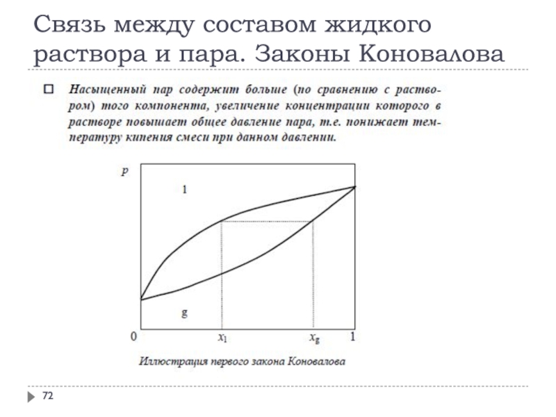 Слайд 72Связь между составом жидкого раствора и пара. Законы Коновалова