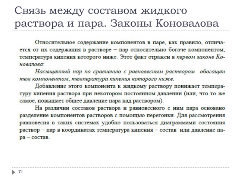Слайд 71Связь между составом жидкого раствора и пара. Законы Коновалова