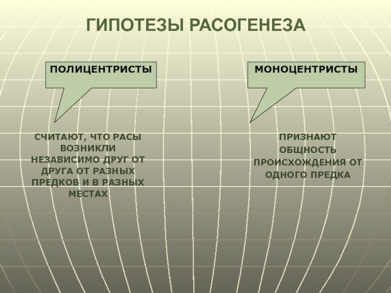ГИПОТЕЗЫ РАСОГЕНЕЗАПОЛИЦЕНТРИСТЫМОНОЦЕНТРИСТЫСЧИТАЮТ, ЧТО РАСЫ ВОЗНИКЛИ НЕЗАВИСИМО ДРУГ ОТ ДРУГА ОТ РАЗНЫХ ПРЕДКОВ И В РАЗНЫХ МЕСТАХПРИЗНАЮТ ОБЩНОСТЬ