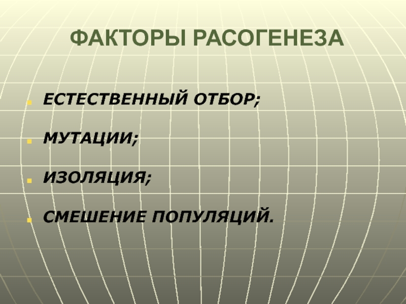ФАКТОРЫ РАСОГЕНЕЗАЕСТЕСТВЕННЫЙ ОТБОР;МУТАЦИИ;ИЗОЛЯЦИЯ;СМЕШЕНИЕ ПОПУЛЯЦИЙ.