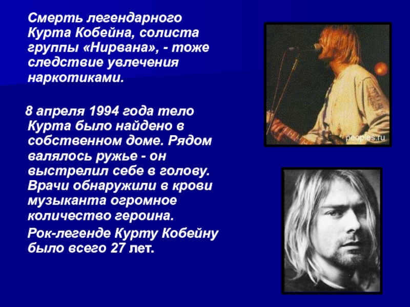 Слайд 27 Смерть легендарного Курта Кобейна, солиста группы «Нирвана», -