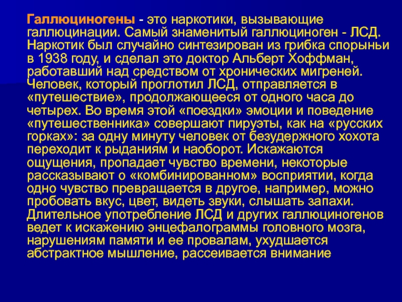 в 1938 году, и сделал это доктор Альберт Хоффман, работавший над средством от хронических мигреней. Человек, который проглотил ЛСД, отправляется в «путешествие», продолжающееся от одного часа до четырех. Во время этой «поездки» эмоции и поведение «путешественника» совершают пируэты, как на «русских горках»: за одну минуту человек от безудержного хохота переходит к рыданиям и наоборот. Искажаются ощущения, пропадает чувство времени, некоторые рассказывают о «комбинированном» восприятии, когда одно чувство превращается в другое, например, можно пробовать вкус, цвет, видеть звуки, слышать запахи. Длительное употребление ЛСД и других галлюциногенов ведет к искажению энцефалограммы головного мозга, нарушениям памяти и ее провалам, ухудшается абстрактное мышление, рассеивается внимание