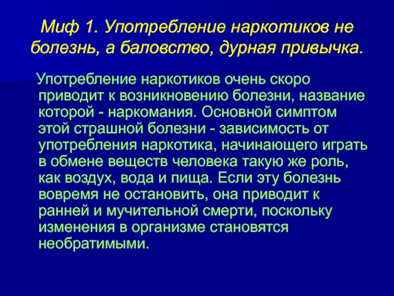 Слайд 35Миф 1. Употребление наркотиков не болезнь, а баловство, дурная привычка.