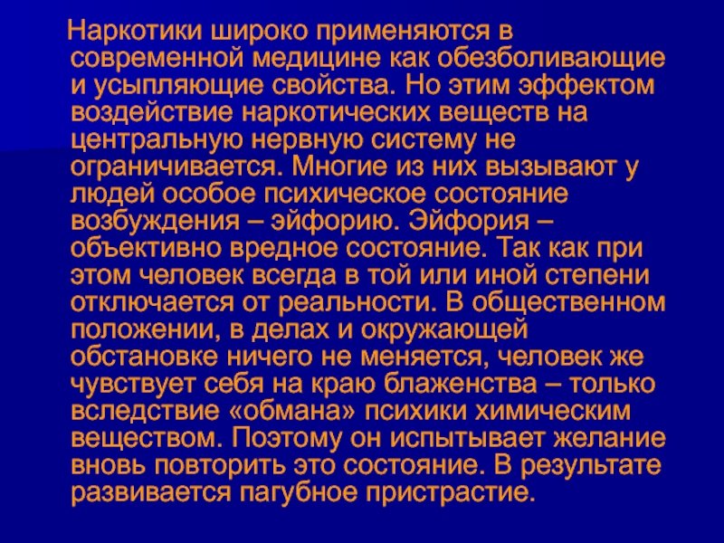 центральную нервную систему не ограничивается. Многие из них вызывают у людей особое психическое состояние возбуждения – эйфорию. Эйфория – объективно вредное состояние. Так как при этом человек всегда в той или иной степени отключается от реальности. В общественном положении, в делах и окружающей обстановке ничего не меняется, человек же чувствует себя на краю блаженства – только вследствие «обмана» психики химическим веществом. Поэтому он испытывает желание вновь повторить это состояние. В результате развивается пагубное пристрастие.