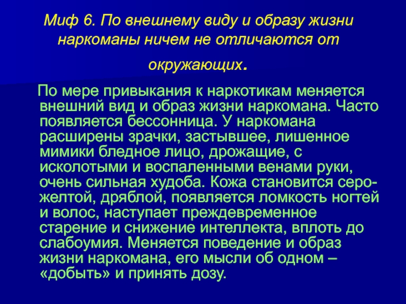 Слайд 40Миф 6. По внешнему виду и образу жизни наркоманы ничем