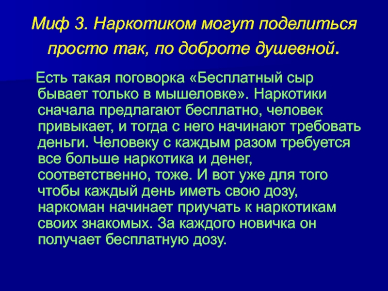 Слайд 37Миф 3. Наркотиком могут поделиться просто так, по доброте душевной.