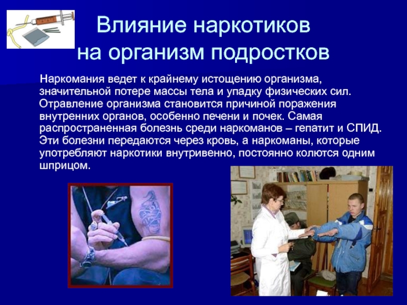 сил. Отравление организма становится причиной поражения внутренних органов, особенно печени и почек. Самая распространенная болезнь среди наркоманов – гепатит и СПИД. Эти болезни передаются через кровь, а наркоманы, которые употребляют наркотики внутривенно, постоянно колются одним шприцом.