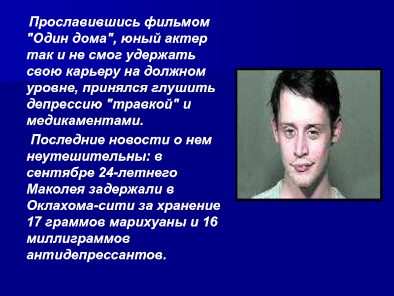 Последние новости о нем неутешительны: в сентябре 24-летнего Маколея задержали в Оклахома-сити за хранение 17 граммов марихуаны и 16 миллиграммов антидепрессантов.