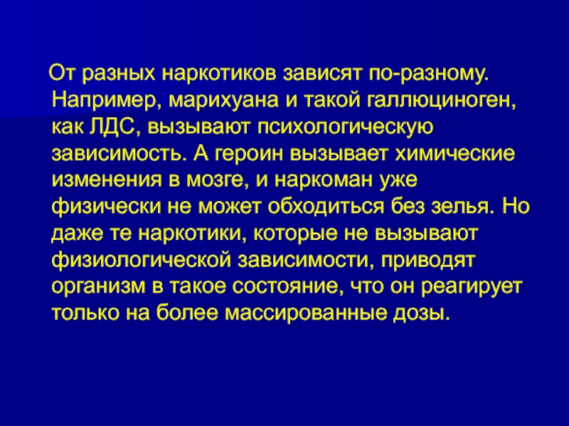 Слайд 8 От разных наркотиков зависят по-разному. Например, марихуана и