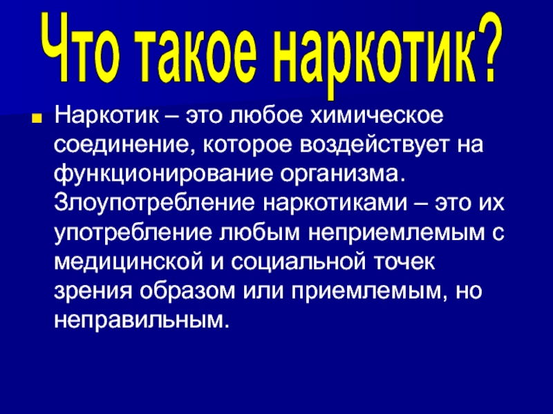 Наркотик – это любое химическое соединение, которое воздействует на функционирование