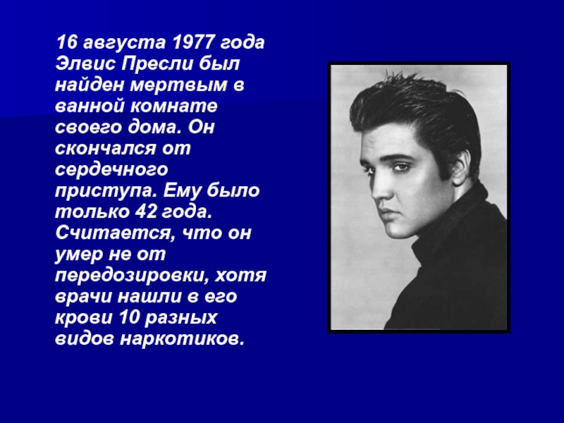 Слайд 30 16 августа 1977 года Элвис Пресли был найден