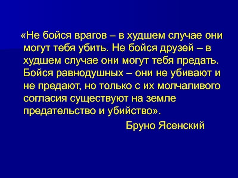 могут тебя предать. Бойся равнодушных – они не убивают и не предают, но только с их молчаливого согласия существуют на земле предательство и убийство».