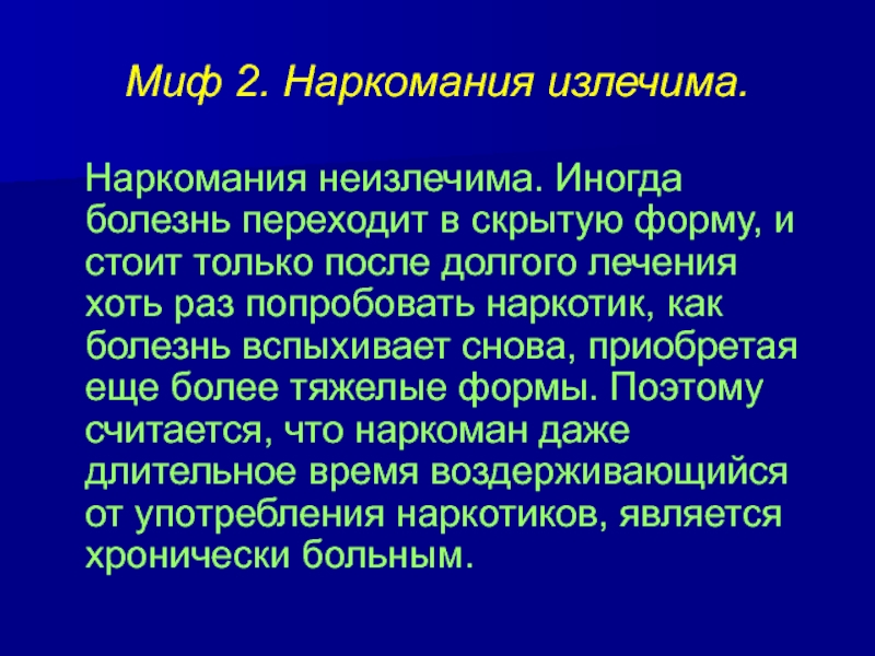раз попробовать наркотик, как болезнь вспыхивает снова, приобретая еще более тяжелые формы. Поэтому считается, что наркоман даже длительное время воздерживающийся от употребления наркотиков, является хронически больным.