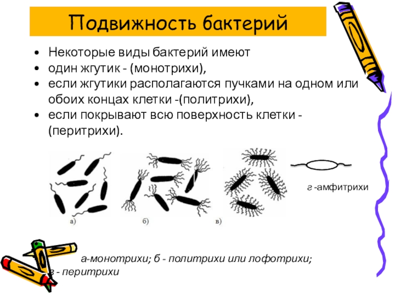 Жгутики имеют палочковидные бактерии и некоторые извитые формы. Наличие жгутиков, их расположение являются постоянными для данного вида признаками.