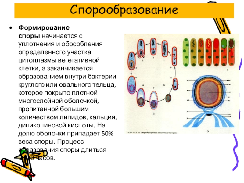 которое покрыто плотной многослойной оболочкой, пропитанной большим количеством липидов, кальция, дипиколиновой кислоты. На долю оболочки припадает 50% веса споры. Процесс образования споры длиться 18-20 часов.