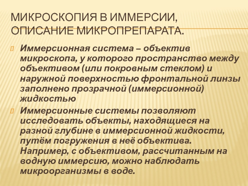 Слайд 12Микроскопия в иммерсии, описание микропрепарата.