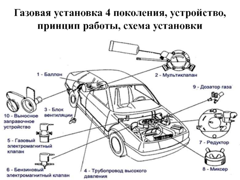 поколений ГБО: баллон с мультиклапаном, магистрали высокого давления, газовый клапан,