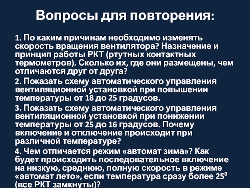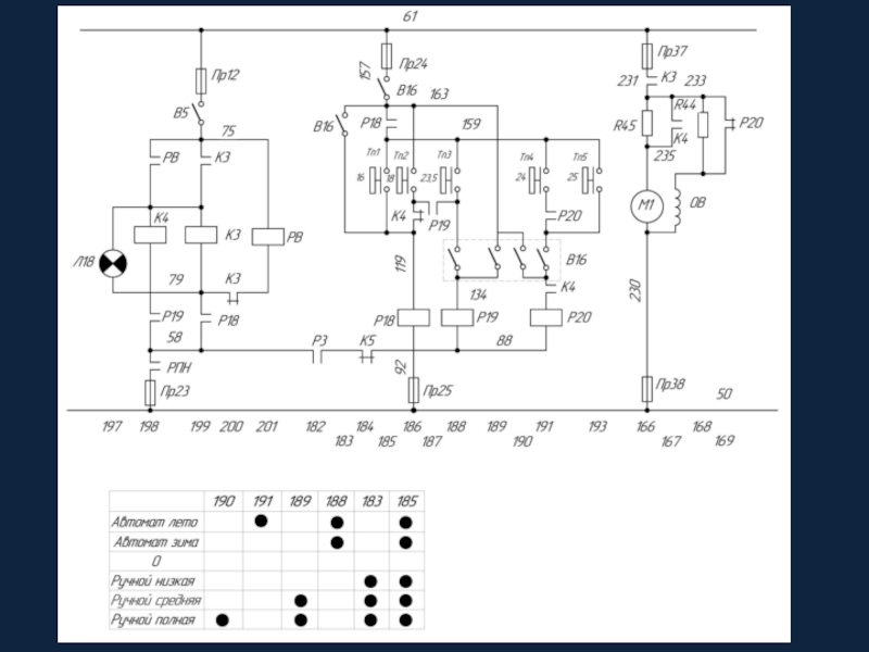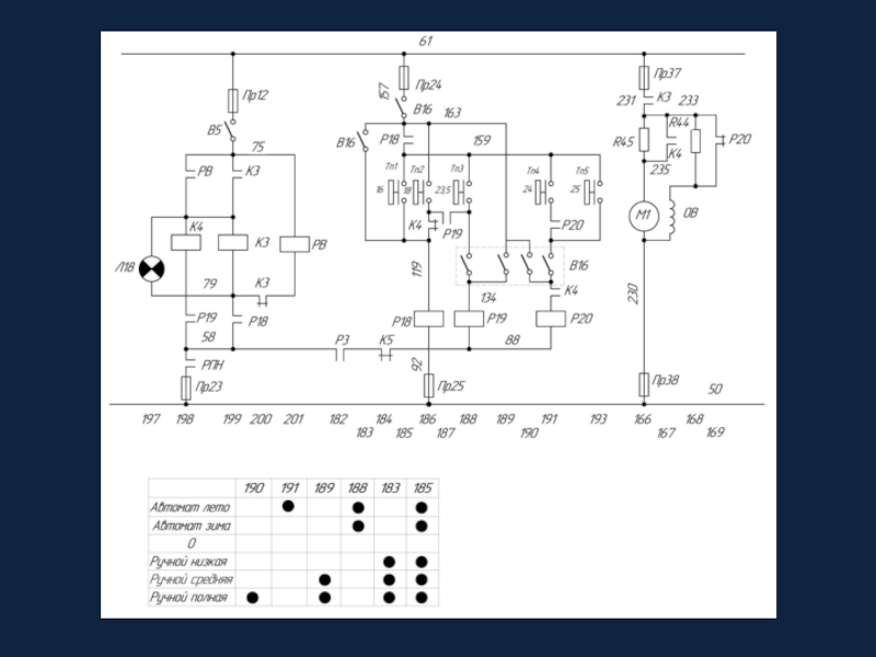 4. Чем отличается режим «автомат зима»? Как будет происходить последовательное включение на низкую, среднюю, полную скорость в режиме «автомат лето», если температура сразу более 250 (все РКТ замкнуты)?