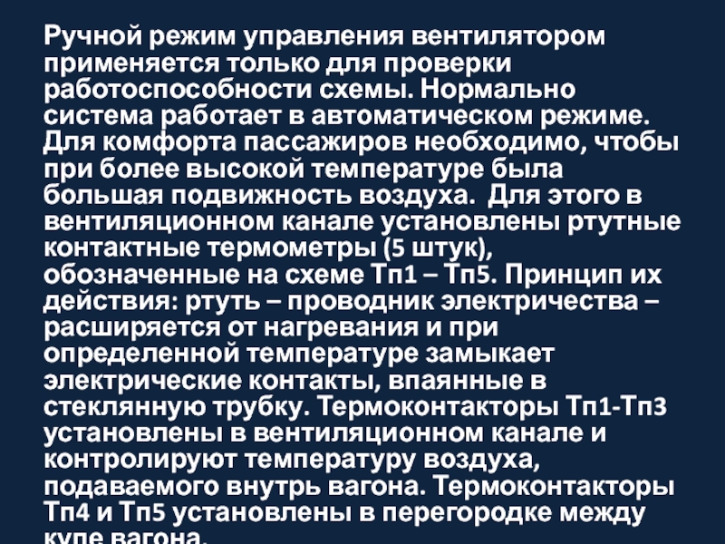 чтобы при более высокой температуре была большая подвижность воздуха. Для этого в вентиляционном канале установлены ртутные контактные термометры (5 штук), обозначенные на схеме Тп1 – Тп5. Принцип их действия: ртуть – проводник электричества – расширяется от нагревания и при определенной температуре замыкает электрические контакты, впаянные в стеклянную трубку. Термоконтакторы Тп1-Тп3 установлены в вентиляционном канале и контролируют температуру воздуха, подаваемого внутрь вагона. Термоконтакторы Тп4 и Тп5 установлены в перегородке между купе вагона.