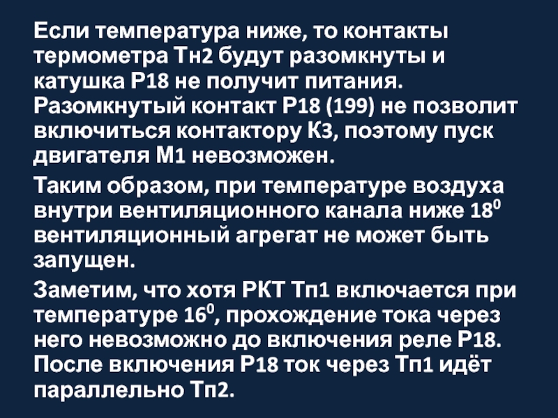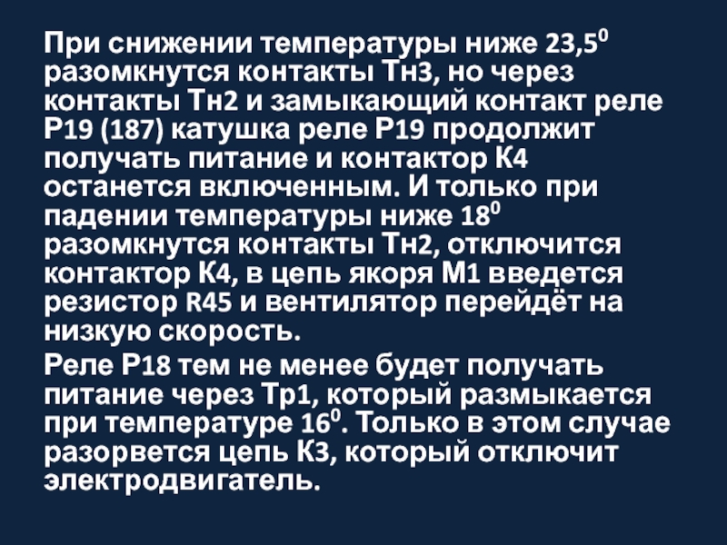 Слайд 10При снижении температуры ниже 23,50 разомкнутся контакты Тн3, но через