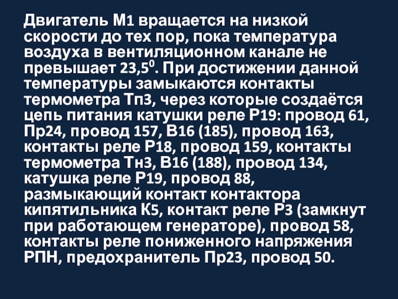 Р19 продолжит получать питание и контактор К4 останется включенным. И только при падении температуры ниже 180 разомкнутся контакты Тн2, отключится контактор К4, в цепь якоря М1 введется резистор R45 и вентилятор перейдёт на низкую скорость.
